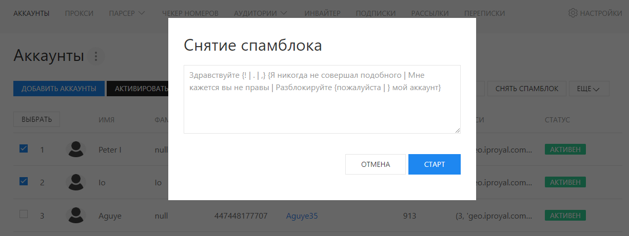 Выберете аккаунт, который находится в спамблоке и нажмите: снять спамблок.