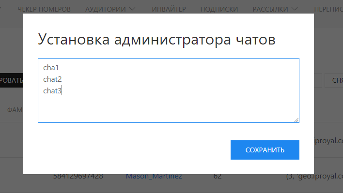 - Укажите чаты, в которых аккаунт является администратором и сохраните. Чаты должны быть указаны короткими именами, а не ссылками.