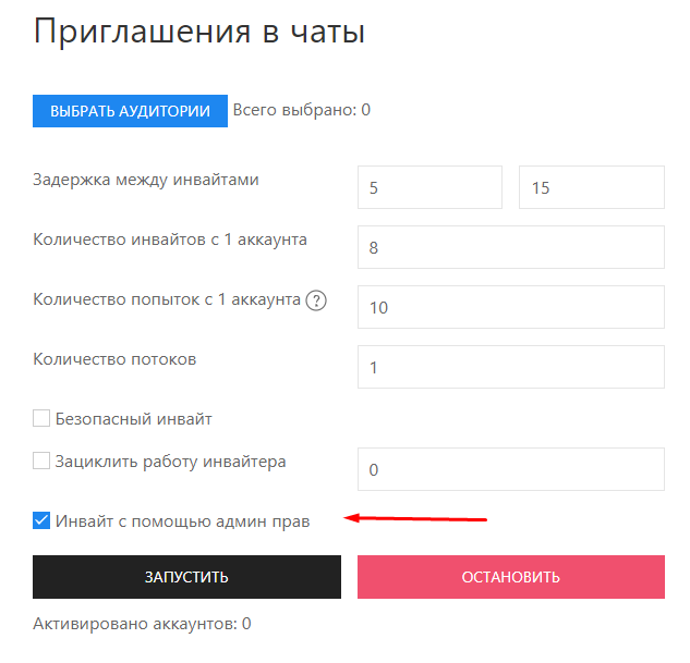 - Выберите чаты для инвайта и нажмите галочку: Инвайт с помощью админ прав