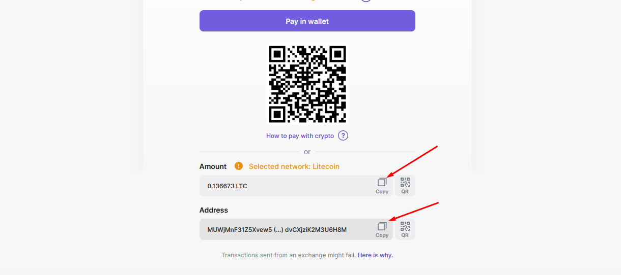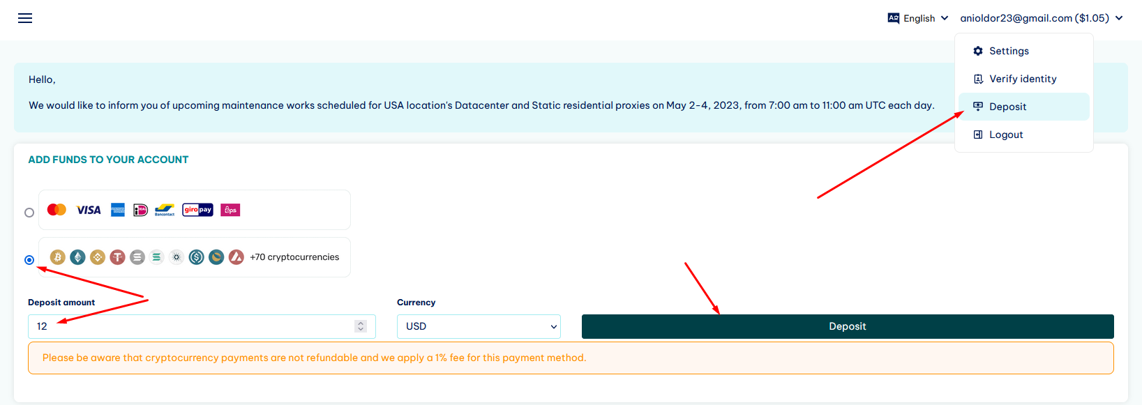 В iproyal вносите депозит и указывайте способ оплаты LTC