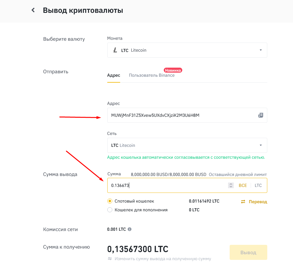 Переходите в Кошелек - фиат и спот и переводите баланс туда и обменивайте на LTC, хотя можно оставить в usdt, как вам удобнее, рекомендуем обменять на LTC и нажимайте вывод.