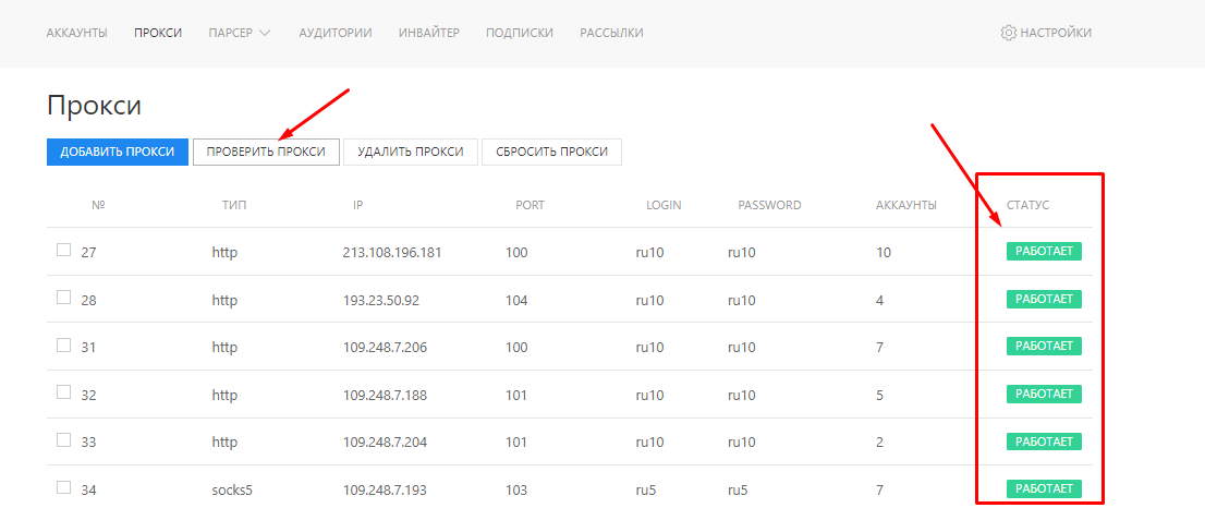 Нажмите кнопку Проверить прокси, они должны стать зелеными