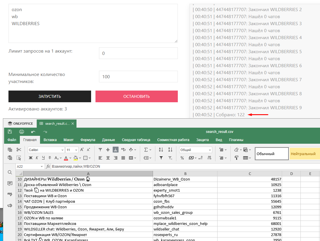 вводим ключевые слова и находим 122 чата по вб и озон за 1,5 минуты.